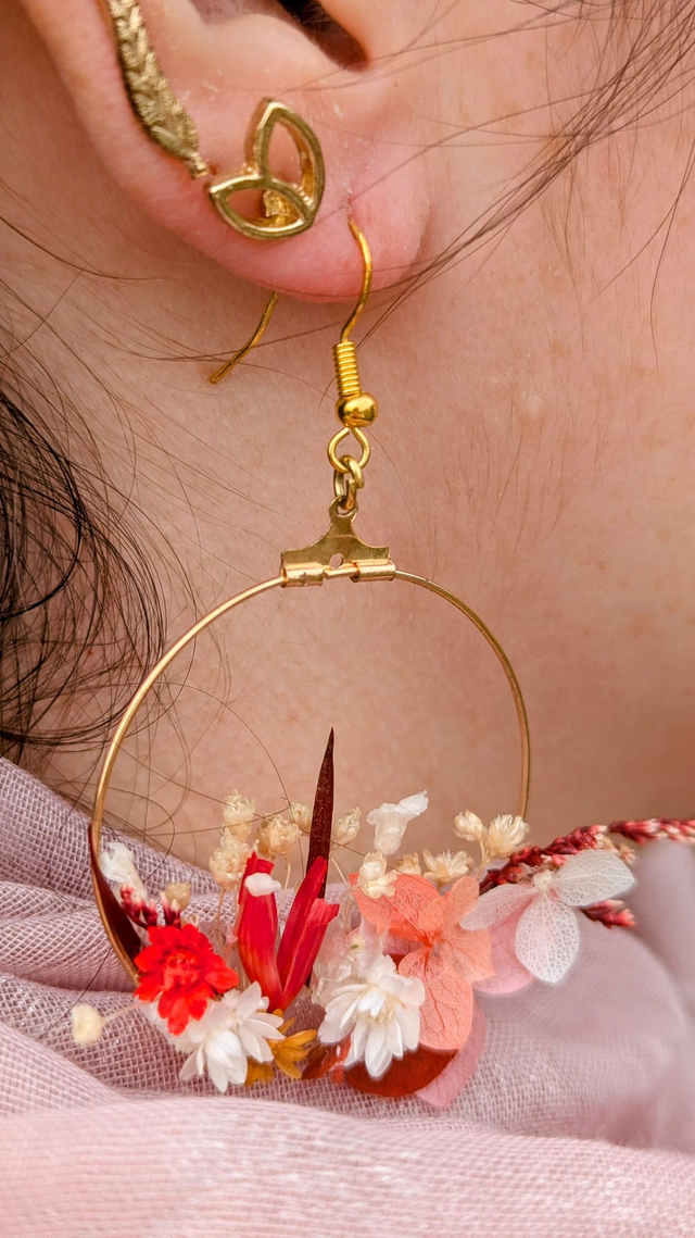 Composition florale sur-mesure sur créoles et accroches en acier inoxydable.